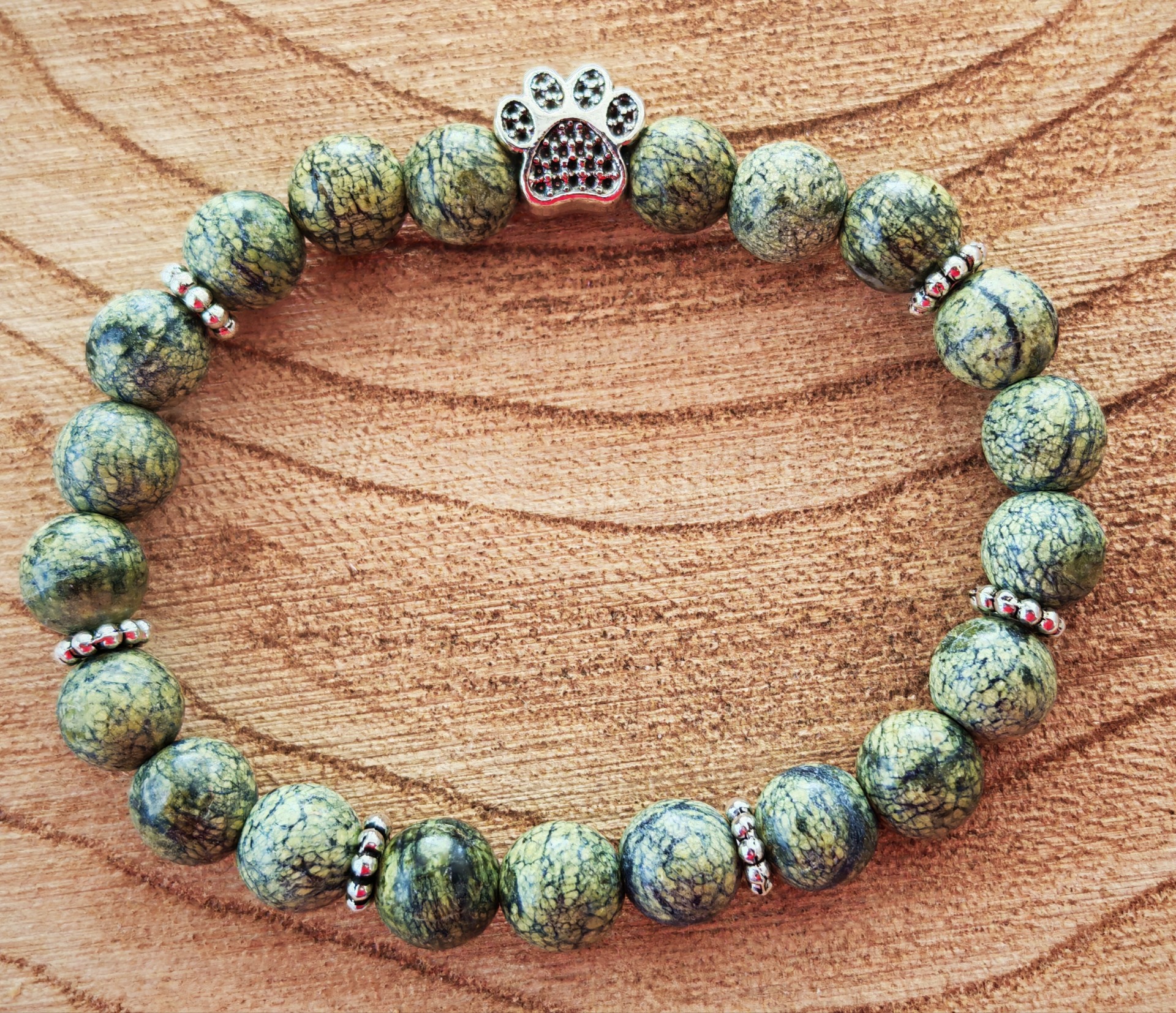 korálky z minerálů - přírodní serpentin + mezidíl ve tvaru tlapky - velikost náramku 15 cm