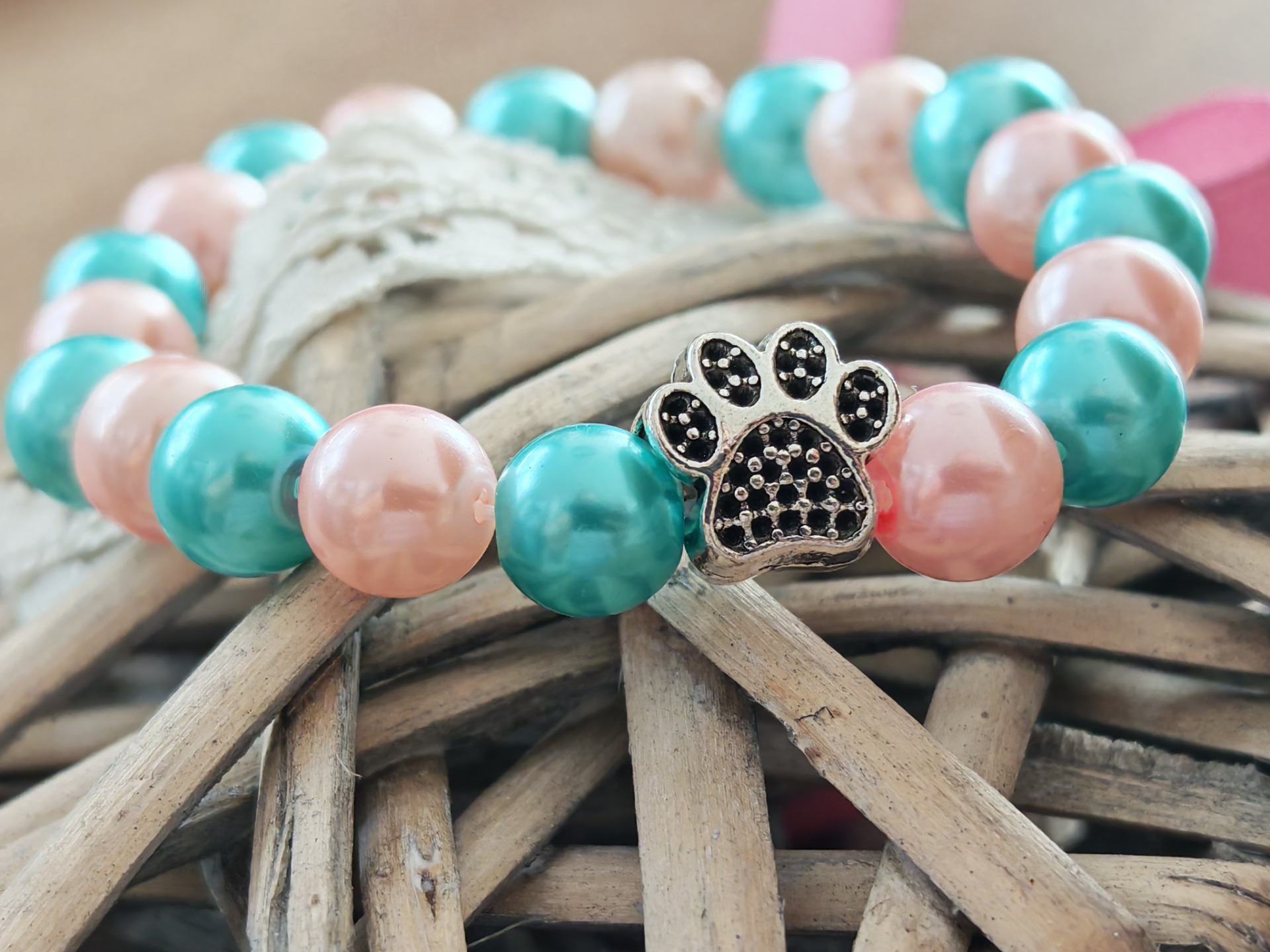 Povrch korálků je barvený sprejovými barvami. Působením kapalin, například potu se může barva stírat.